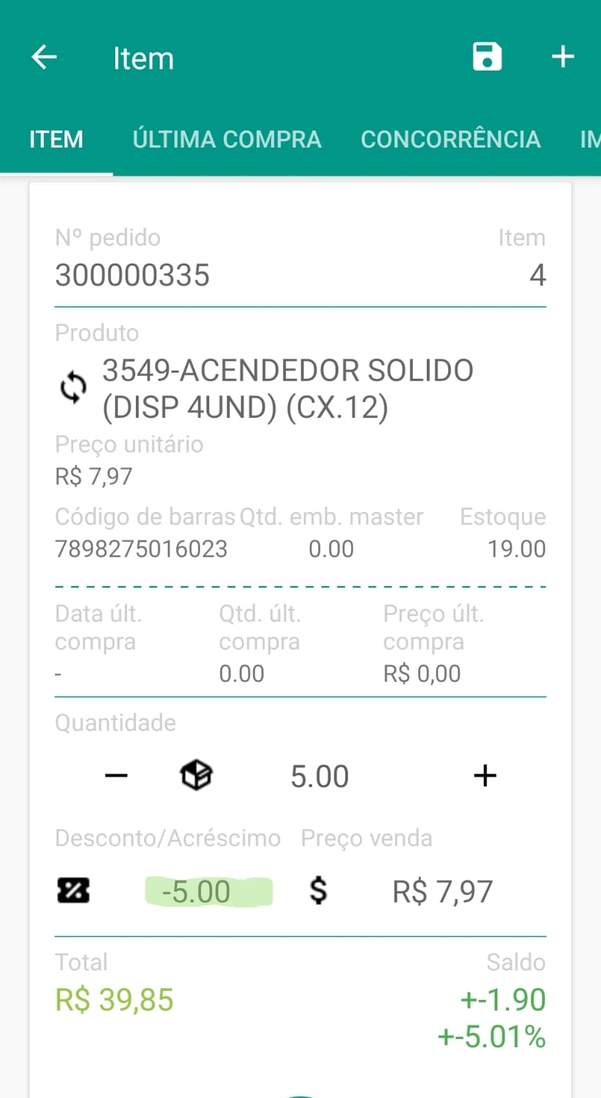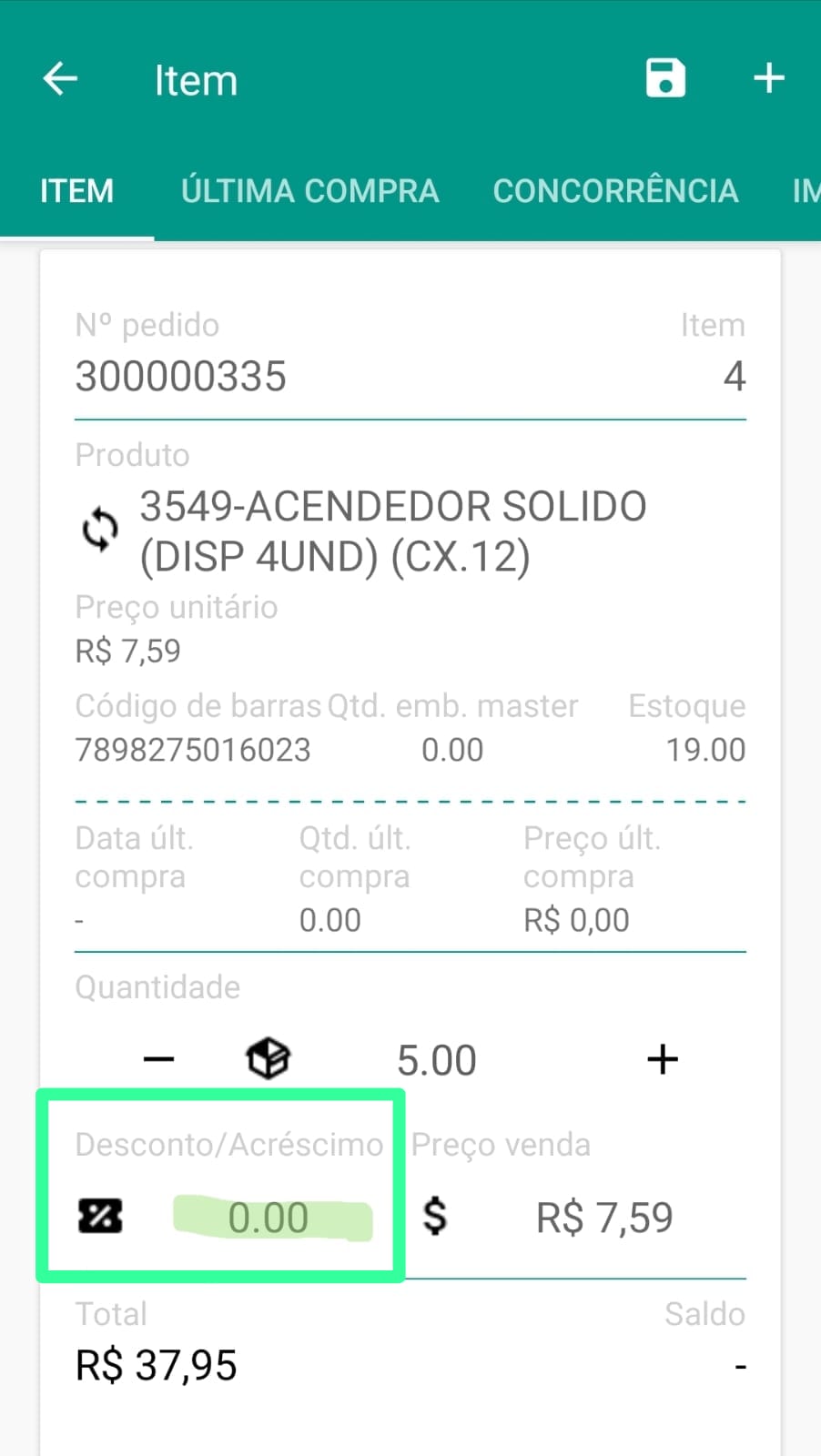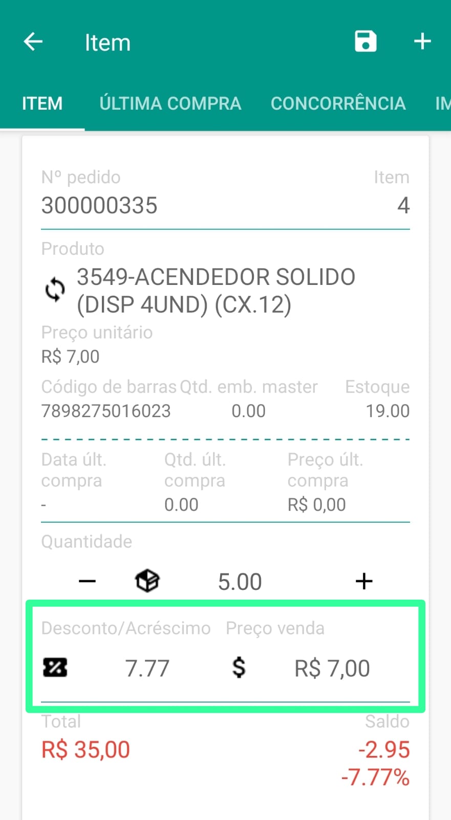 - No campo Desconto/Acréscimo, adicionar o sinal de negativo ( - ) antes da porcentagem. Por exemplo " -5.00 " , após isso será acrescido o valor diretamente no preço de venda do produto.