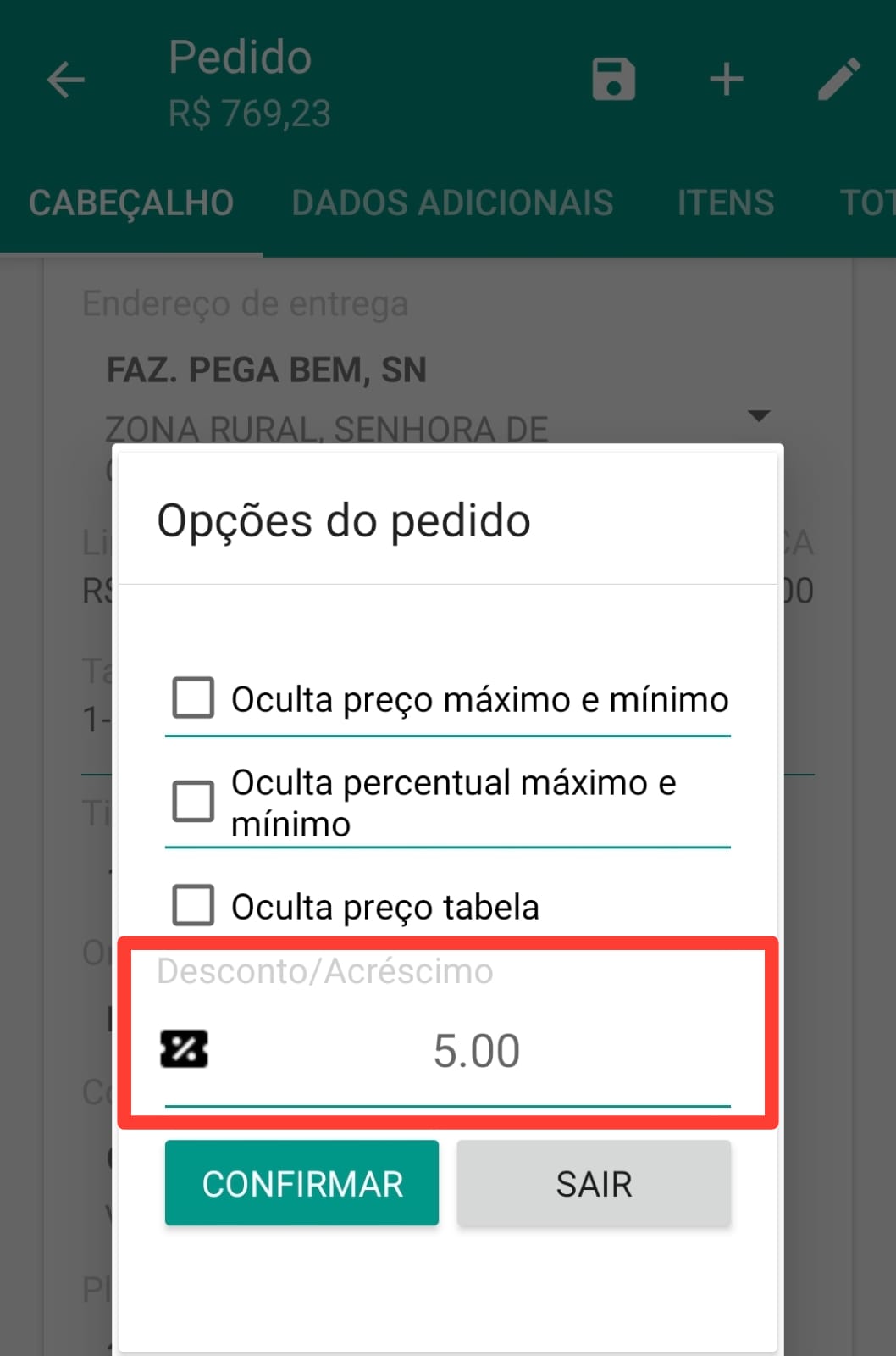 OBS: Ao adicionar um desconto no cabeçalho do pedido, este desconto será aplicado a todos os itens dentro do pedido, e não ao valor total do pedido.