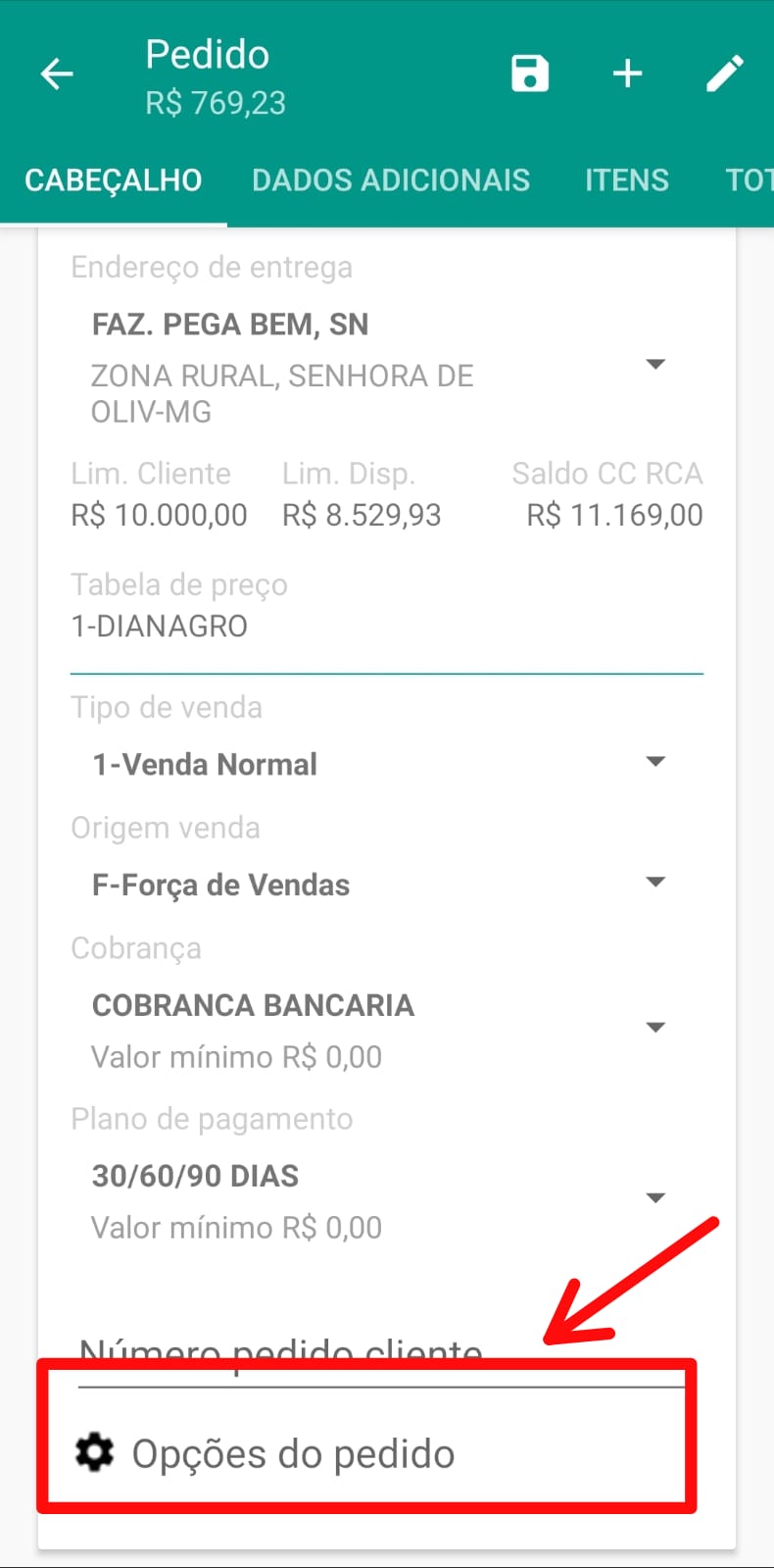 - Primeiramente na tela de pedido, selecione "Opções do pedido" :