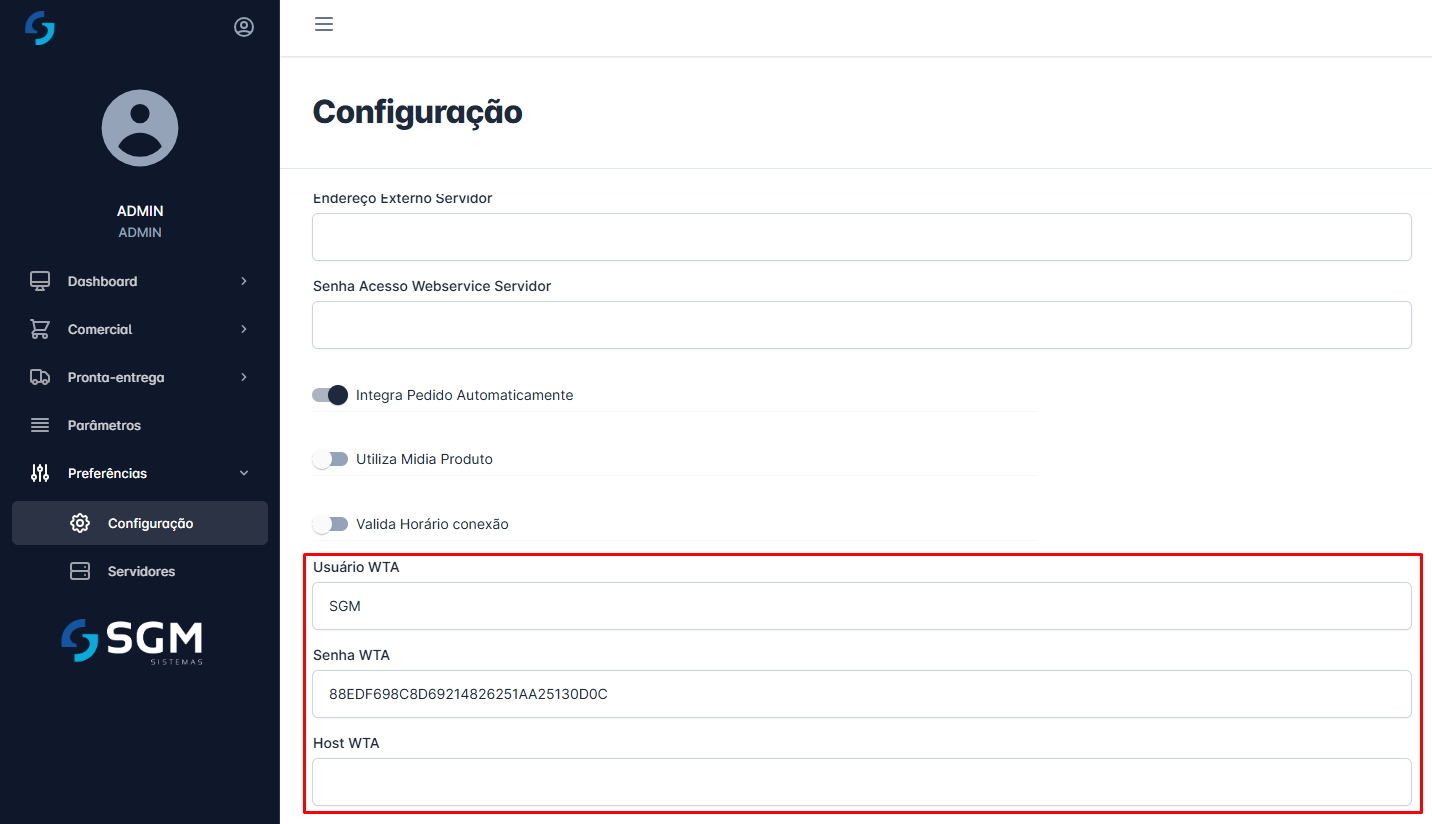 - HOSTWTA: Utilize o IP da máquina onde está instalado o WTA e a porta utilizada para a comunicação com a aplicação.