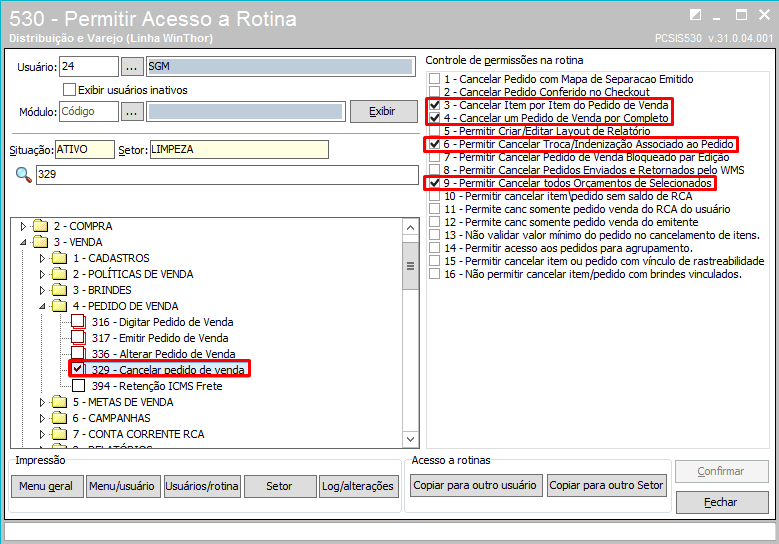 2. Permissões na Rotina 329 - Cancelar Pedido de Venda e em suas permissões de controles da rotina