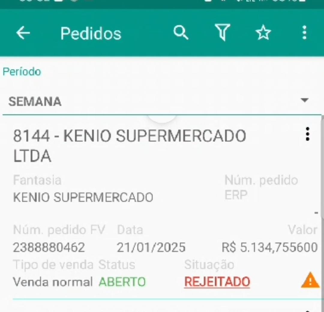 - Na guia Pedidos, no força de vendas. O pedido será apresentado com o Status REJEITADO .Conforme imagem abaixo
