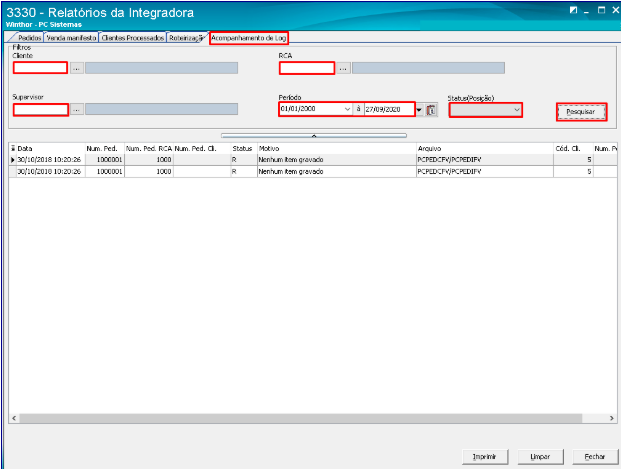 - Acesse a rotina 3330-Relatórios da Integradora e clique na Aba Acompanhamento de Log;