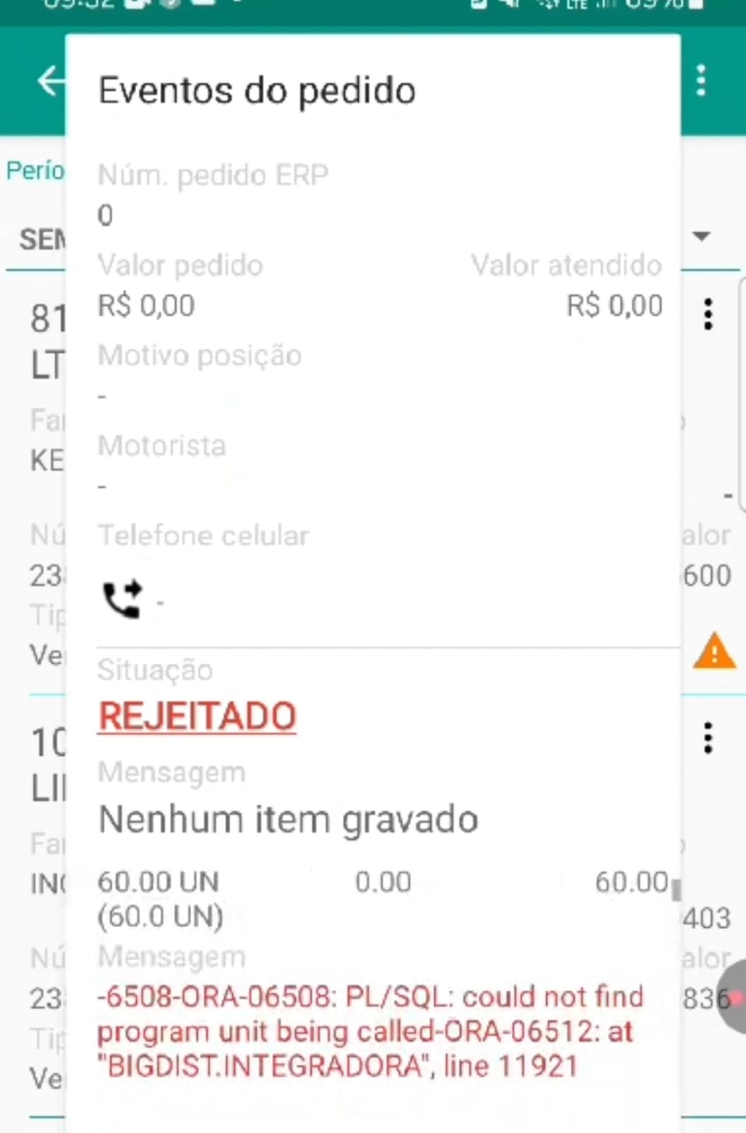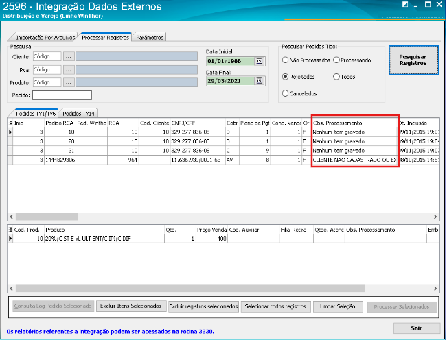 Observação: O motivo da rejeição não é originado pelo Força de Vendas, o mesmo só apresenta as observações vindas após integração do pedido.